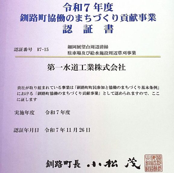 釧路町協働のまちづくり貢献事業 2025.11.27 昨日、釧路町長より細岡展望台周辺清掃・駐車場及び給水施設周辺草刈事業に関して「令和7年度 釧路町協働のまちづくり貢献事業」の認証書をいただきました。 今後も地域に貢献できるような事業を続けてまいります。