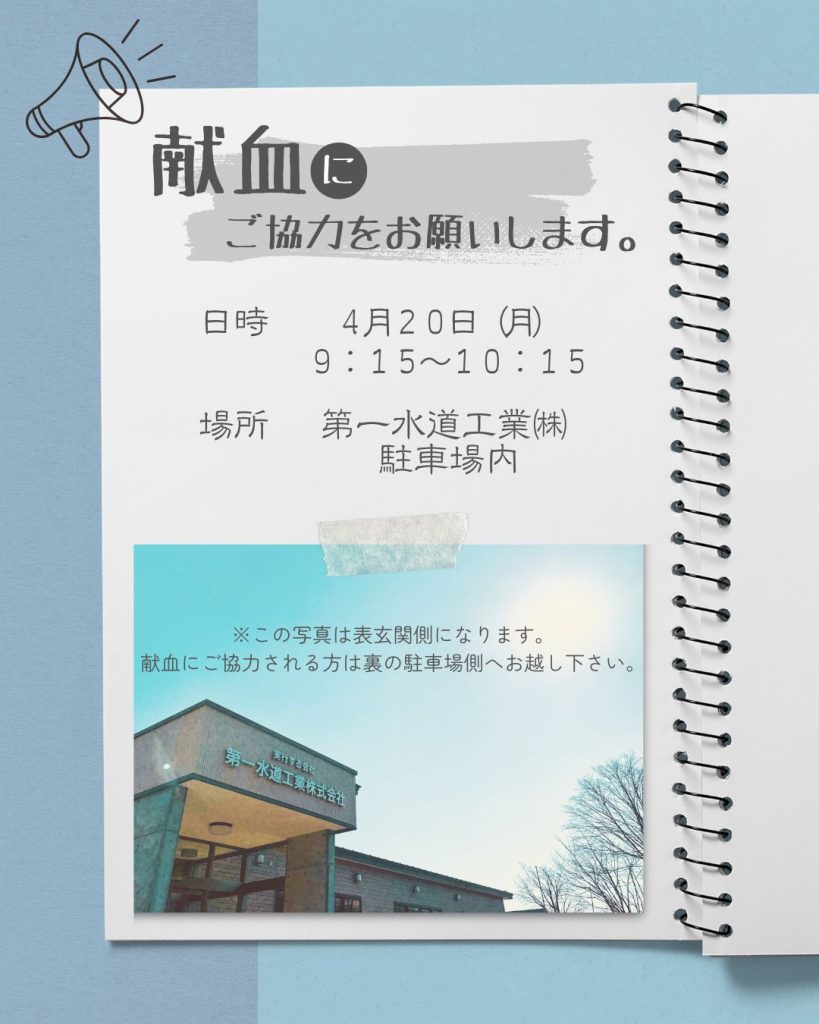 献血へご協力をお願いします。 2026.03.23 今年も弊社敷地内にて献血が行われる予定となりました! 日時:4月20日(月) 9:15~10:15場所:第一水道工業㈱ 駐車場内 北海道では1日約700人の献血協力が必要となっております。医療機関へ血液を安定的にお届けするためのご協力をお願いします!